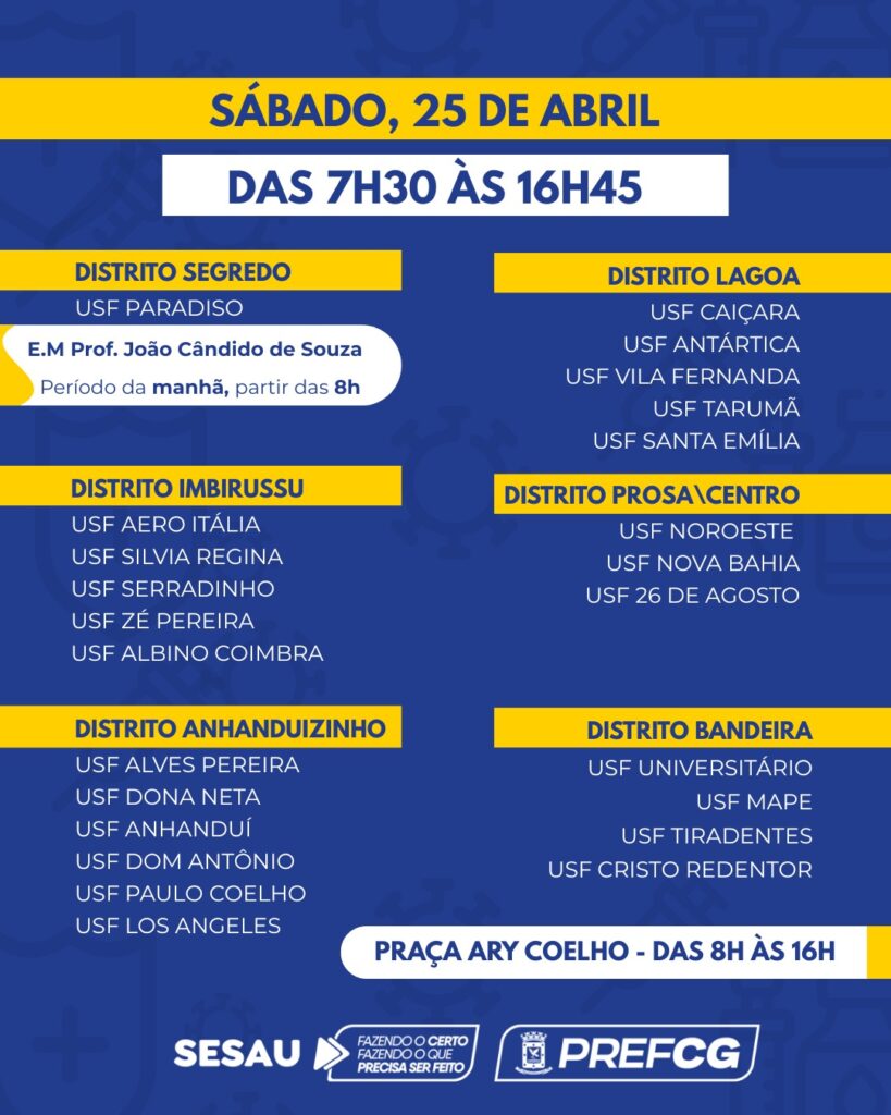 No Distrito Lagoa, estarão abertas as unidades Caiçara, Antártica, Vila Fernanda, Tarumã e Santa Emília. Na região Prosa/Centro, a população poderá procurar as USFs Noroeste, Nova Bahia e 26 de Agosto. E, no Anhanduizinho, participam as unidades Alves Pereira, Dona Neta, Anhanduí, Dom Antônio, Paulo Coelho e Los Angeles.